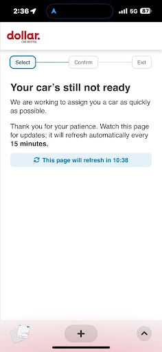 First, we arrived at the airport and found the car rental shuttle pickup spot. For about 45 minutes every other rental company sent at least 3 shuttles past, but no Dollar. The phone number listed was the national corporate line, so there was no way to check if we were even at the right place.