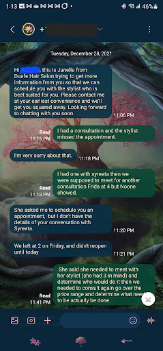 December 28th I get a text from Janelle who knew nothing about the situation. I let her know that a stylist never showed up for the virutal consult on the 24th and she stated that they left at 2pm that day and apologized. I explained my hair situation and the prior conversation that was had with syreeta.