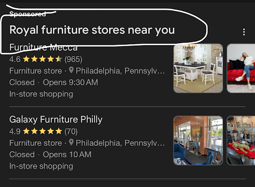 Shady advertising tactics I ended up here by accident!!! I was searching for a different furniture store on Google and somehow got directed to this one. I shouldāve known when I saw the name was different, but I didnāt think much of it and that turned out to be our biggest mistake!!! They do not operate anything like the store I was originally searching for.