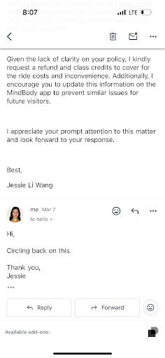 I reached out to explain the situation and urged them to at least update their policy on the MindBody app to prevent this from happening to others. Not only did they fail to respond, but they also blocked me from booking future classes, so I have no way of even checking if they addressed the issue.