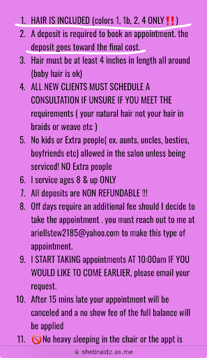 Read moreIâve been here total of 3 times. Since 2023, Iâve gotten a silk press from Danni every fall. I go back to Danni because she is very gentle during washing, gets deep in the scalp, and my hair always reverts natural after my press. My birthday was beginning of 2025 so I decided to try something new. I picked up work, got a job and all to get a sew in by Arielle for my birthday. I have no problems with Arielle, she is very nice and accommodating. I thought hair included in her policies also meant bundle hair, my mom thought her prices were expensive so I figured that meant it provided everything⊠I wouldâve brought my own hair if I knew. I feel it should be clarified only braiding hair is included. Iâm slightly dissatisfied because I donât look how I envisioned. Pretty sure I overpaid because I paid a $25 deposit, $75 for the silk press, and tipped $10. At least she was compensated but I paid a total of $110 for hair I donât love since I settled on it. I wanted protective styles all 2025 so hopefully my hair wasnât affected as much by the heat. I love the environment; the R&B, the conversations are interesting too. The work is quality but this particular mix up was discouraging. Just warning, donât be me,...