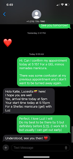 Read moreI will NEVER EVER EVER go to another salon! From the moment I walk through the door, I have felt nothing but peace and love! Karina, Mimi, Blanca, Gabriella, Justin, Zahar and the rest of the lovely woman in Mi Cumbia have become like family!!! Karina, the owner is the best!!! Her hands are magical! I have extra super sensitive skin and have had terrifying experiences in the past from other places. My face has been burnt from waxing and I have had major break outs from regular waxes. But the wax used in Mi Cumbia has saved my life! Honesty, I have been searching for an Oasis for many years and can not tell you how happy and blessed I feel to have found it! It's amazing how welcomed every single woman and Justin (Karina's wonderful hubby / owner) makes me feel during every visit!! I wouldn't miss my biweekly appointment for anything. All products sold here are natural and organic. The Lemongrass Sugar scrub is to die for!!!! Im totally obsessed and ALWAYS have a big jar in the shower. After 12 long hours of being an RN, I'm so exhausted, sore, tense, overwhelmed and frustrated. But as soon as I use this healing scrub and work it into my feet all the way up to my face, I feel refreshed and extraordinarily much better! It's absolutely amazing!!! Truly it's like having a spa in your bathroom. And believe it or not it's lemon so men also will love using it. My coworkers husband is so in love with this scrub! Lol!!! I give these scrubs out as gifts and they are ALWAYS a hit!!! The coconut lotion and everyother product sold here are just spectacular! Please come in and enjoy a delicious cup of Columbian coffee while you sit back and melt into your chair as you get the best manicure and pedicure of your life! And remember all their products are so gentle and toxic free, so my daughter just loves coming here too!!! It makes me feel fantastic knowing she is both safe and happy at Mi Cumbia!