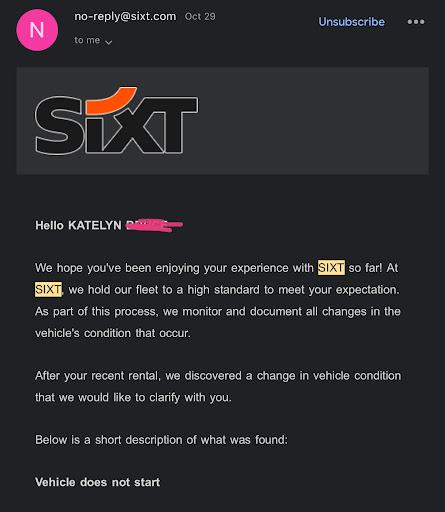 Eventually, they tow the car, and I stand on the highway shoulder, waiting for an Uber that canāt find me. I end up paying for a Motel 6 for two nights because my next flight isnāt until the following night, plus yet another Uber to the airport. Then, once Iām home, Sixt emails me, asking me to explain why the vehicle ādoes not start.ā Are you serious? Did you not log the call or the towing? I sent a professional response, but Iāve heard nothing back.