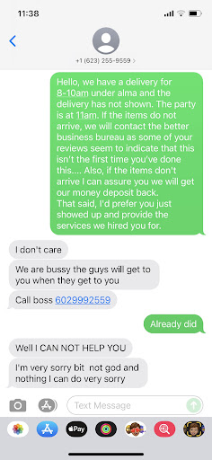 To the owner's response below: You are kidding right??? You didn't deliver anything to our house and you sure as hell didn't save the day. After your total and utter lack of communication (busy or not), we bought everything for our party from the store last minute. Your delivery people called to say they could arrive after the party was over and we told them that they must be joking and not to bother. Wasting your time writing that pathetic response and lying in the process makes you look even worse than you already did... if...