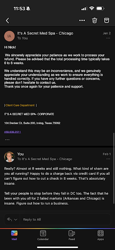 I was disappointed with my recent experience at It’s a Secret Med Spa. I had an appointment to dissolve my lip filler and add cheek filler, but things didn’t go as planned. When I mentioned that numbing cream has caused itchiness and redness in the past, the provider advised that I would need to reschedule and take Benadryl beforehand. I completely understood and agreed to reschedule the cheek filler, but I asked if we could move forward with dissolving my lip filler without the numbing cream.