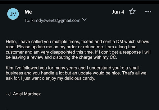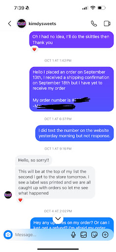 I’ve been unsuccessful in getting my order from this small business. I’ve reached out via their online portal, through text message, and I have made several phone calls. I have attached proof of all this to my review for reference. Out of the 7 times that I called this place, I was able to speak to this Kim individual twice. The first time this individual manually pushed my order through but that was after it had been almost 1.5 weeks since placing the order. The second time we spoke she asked me to call her back because she was busy setting up. I called her back and no one answered and since then no one has answered the phone during their business hours. I have proof of all this which I have attached to this review.