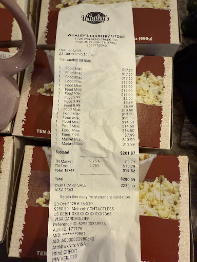 Not Enough Stars for this one! I have meant to write this review for at least two years and my family has visited this place every single time we are in Pigeon Forge. Whaley's Country Store is keeping in the wonderful tradition of the country general store; something for everyone. We love this place! You can spend an hour walking through the store just taking it all in. This place has ice cream, fudge, popcorn and candy for the kids and kids at heart. For the adults, wow! They have everything and I mean it just takes some to take it all in. The Amish goods are always a hit, the farm products they carry you cannot find anywhere else. This is one of the only places that I have found the Jake and Amos Salsa product line. Recommendations: Jake and Amos products, lotions (goat...