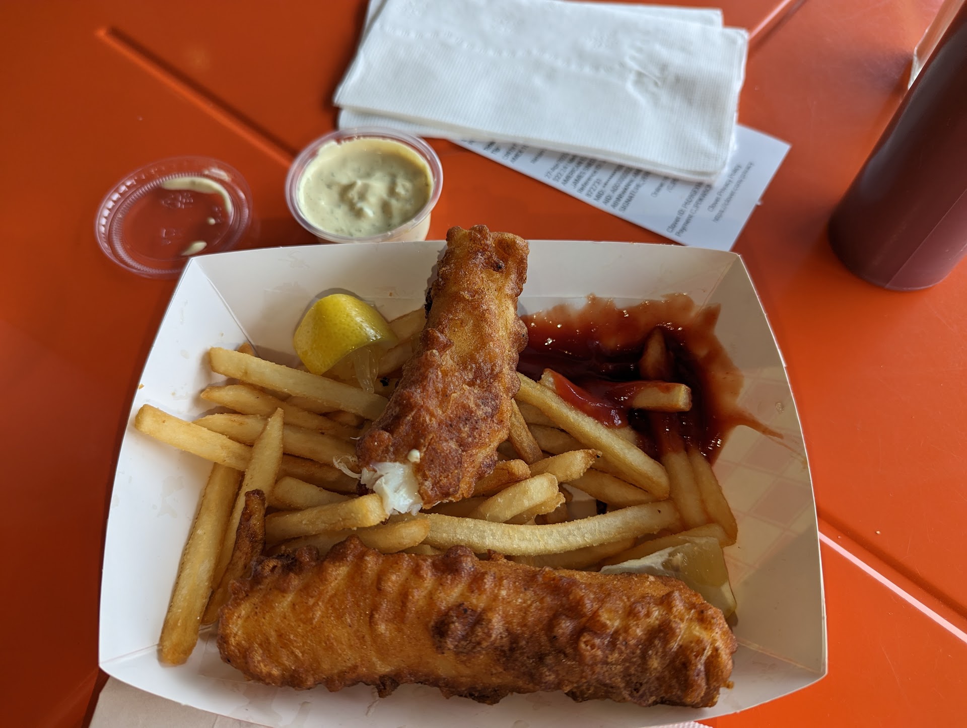 I found the fish and chips, the item I was seeking since the day before. I ordered the halibut fish and chips, and found a small table by the window.