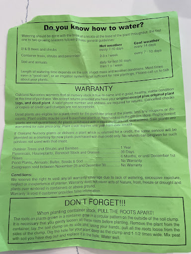 We have been customers of Oakland nursery for a while now. We have been very good customers for the past 2 seasons spending around $2000.00 on various plants and bushes. Very friendly, eager to assist with questions and very thorough when checking out and explaining their plant warranty/guarantee to you with a smile while stapling your receipt to the green warranty paper.