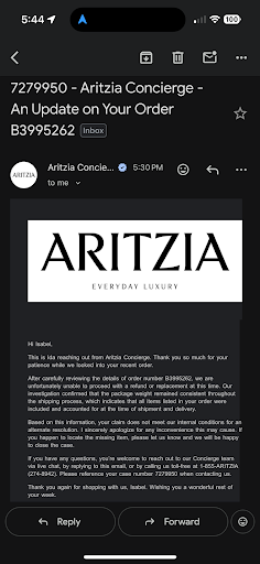 Ā Ā Ā Read moreExtremely disappointing first experience at Aritzia Legacy West. I went to return one item, but the manager carelessly returned a completely different item from my online orderāsomething I did NOT want to return. The item I actually wanted to return was ignored.