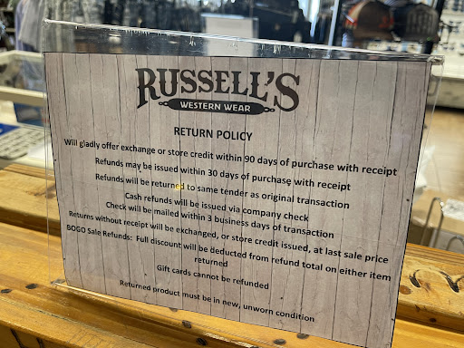Read moreAlways a wonderful experience interacting with the great at Russell's. Started in Plant City looking for new work boots; found a great pair but they didn't have my size. One of the best things about Russell's is multiple location close to me. They called the Dover store and had them hold the boots cor me. So glad they did because it was the last pair in my size and wouldn't you know it, just as I arrived in Dover there was someone asking those boots in my size. They told him they were holding g a pair cor me and if I didn't show up then they could let him buy them. Was great to see the respect these young folks show their customers. I would recommend Russell's to anyone looming for top names in western wear and a place that treats you with respect. The people make it so comfortable. Thank you to all those who helped me out today and every time I've been to you stores. Definitely gets top...