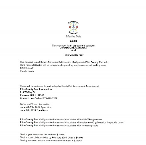 They refused to pay us and tried to alter the signed contract, they even contacted the news station WGEM and claimed we only showed up with 3 rides. I, as well as others, have been trying to tell the truth on their Facebook page but they keep removing my posts and anyone elses posts immediately and block us all from the page. All we are trying to do is share the truth with everyone as they have done us wrong. We have video footage as well of our rides and more was coming. If you are a carnival owner don't book in with them they don't pay you, and Pike County Fair you need to stop using our logo...