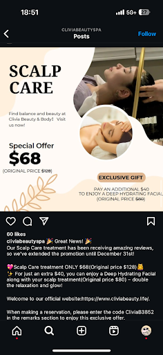 Read moreoriginally came here because I saw a good review of this on tiktok and saw that they had specials. I drove almost an hour here to do the $68 headspa and then I tried adding the deep hydrating facial for an additional $40. The advertising is a bit deceptive since they advertised it as originally $80 but when I added it the lady said it would only be a mini facial.