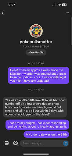 I purchased cards from this business on whatnot via a livestream on May 24th. By June 17th I still had not received the cards and been told multiple times that they were shipping out my order the next day, that there would be new tracking, etc. Finally, on June 17th I reached out to the owner, Connor, on Facebook. He told me that a worker had mislabeled multiple orders, so multiple people’s cards were shipped out to the wrong people. He showed me the cards that they still had from my order, and we figured out which were missing. On June 28th I finally received the cards still left in my order, and refunds for the four missing cards had been issued via whatnot. I left an honest review much like this one on their whatnot page, only to find out after checking again to see if they were live, that I had been blocked, I presume for leaving the review. Nothing in this review or that one was defamatory or untrue. I was given the run around for half a month about my order when the mistake could’ve been explained to me immediately. I should not have had to reach out to the owner on Facebook to figure out what was going on. Overall a really poor experience with this business. Connor told me if I wanted to shop with them again that he would take “extra care of me,” but I suppose that won’t happened since I’ve been blocked from shopping with them. Editing to add the business owner will say rude things when you leave honest reviews. I’ve added a...