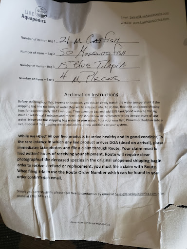 Read moreQuite a few negative reviews, it is a hard business and shipping live fish is difficult. You have to have realistic expectations and be patient. The climate is different for everyone and no matter what you do, you may have dead fish. I ordered 50 small channel cats, it ended up being too late in the year and they were out of stock after I placed my order. I worked with customer service to upgrade my order to 20 mediums at no extra cost to me and live Aquaponics ate the extra shipping for me. I live in California while they are based in Florida, so I know the fish had a bit of a rough ride. I also did not receive a shipping notice, but this could just be technology, luckily I was home. Upon receiving them, one bag was leaking from the top but this would have only happened if the box was flipped or tossed (shippers fault). I did however open the box to find all the fish alive. One was floating upside down but still breathing, after some acclimating though he perked right up. They were released into my tank this morning and I fed them this afternoon, they all ate nicely and look healthy and active! My only concern is that they do seem to be underweight for their size. A few weeks of good feeding will make up for it though! So far my experience is positive and I would recommend giving...