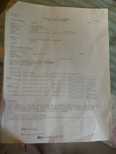 I was hesitant about sharing my review because its a small town and I don’t want to get embarrassed, but I’m hoping by sharing my experience that this will bring awareness that mental health is important & should be taken more seriously. The incident happened back in Jan 2024, I had went in to print out pics for a collage. Laura knew exactly what I was doing because she gave me the cord. I had thought I could print the pics through Bluetooth….i was wrong. What happened was I was in the store for 40 mins, I had pictures in my cart and I was working on my last few. I wasn’t planning on staying long I did have my grandma in the car waiting with it running. A couple songs came on that I sang to & danced to….last time I checked it wasn’t illegal to sing/dance. There were employees next to me talking about expired foods In the coolers from the previous year. They knew what I was doing… Or at least I thought so. I looked up & officer, Josh Freese (Someone I go to church with) Asked me what I was doing. Thrown off guard, I gave him a fist pump told him what I was doing…& he questioned why I was there for so long. The employees did not check on me, or ask me if I needed any help Instead, they called the cops. Why? I wasn’t causing any harm. I had just moved back into town after a really bad break up, I was trying to print off pictures of my fur babies. At this point, I had questioned the employees as to why they called the cops & all three of them were standing behind the counter scared. Again why? At this point, Officer Josh Freese Called for back up … That’s when my grandmother walked in. I wanted answers as to why the cops were called… There were multiple answers… Intoxicated, Drug user, & because I was singing/dancing. Attempting to go back into the store to still get answers Officer Alex Ruiz put her hands on me and reached for her taser. All this was uncalled for. I had left. That incident, Stephanie had called the cops. Went back the next morning, hoping to get a different crew so I can explain to that manager what happened. I ran into Laura there was another woman at the counter (missy or Melissa). I had walked up to her and started talking to her about what happened. I looked at Laura and asked her what if I had a disability? She responded, “ I work with mental retardardation & she knows how they act”. I was humiliated, embarrassed, and degraded. I go down an aisle to catch a breather. Realization hit me. They don’t care. At this point, I’m having a breakdown in the aisle. The only person that was there helping was my grandmother. INSTEAD Laura called the cops. I just wanted someone to watch the tape & see how the employees treated me as a valued customer. Officer Josh Bray And Officer Derek Renken showed up. I highly applaud Officer Derek Renken for handling the situation, the best he could! I just wish Officer freese and Ruiz would’ve handled the situation better not knowing what they’re walking into. On the report, it says possibly intoxicated or has mental issues. I’m not saying whether I am or not the victim here. The situation could’ve been handled differently. Don’t abuse your power. Maybe there’s classes on how to handle someone with a mental illness? If so, Stephanie, Laura Chaplan, officer Josh Freese and officer, Alex Ruiz all need to sign up for that course. Now I have to drive to Bloomington if I want to shop at Walgreens. How embarrassing!!! Save your money and shop at CVS...