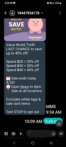Read moreBAIT AND SWITCH SALES! So I receive a text from Value World saying there was a sale for 40% off, all locations. So I drive 45 mins to shop. I buy a lot of stuff thinking I will be getting 40% off. They tell me "White tags excluded". The entire store was white tags. I asked where the colored tags are? They say there are a few in the women's section. So I pull up the text I got for the sale, not one word about white tags excluded. And the manager Dee was extremely rude and unprofessional. She pointed to some sign by the door, and I said I drove 45 mins to get here because the text said there was a sale. She was like "I dont know what to tell you" and just walked away. I went ahead and paid full price and realized I should have had $54 discount. The very next day, I receive another text for the same sale, this one said "white tags excluded". So I called corporate and actually spoke with the lady that sent out the text and she confirmed she made a mistake on the first text that went out. And all I ended up getting was a "Sorry about that. Here make sure you sign up for email notifications". Needless to say, I will never trust another text from Value World and its not likely I will ever shop there again.