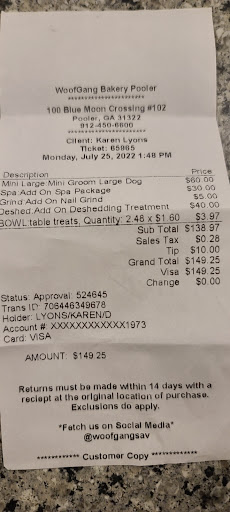 Read moreI never write reviews but I felt the need to after my horrible experience. After my go-to groomer moved out of state, I've been looking for new groomer for my golden retriever and decided to give Woof Gang Bakery in Pooler a try. I made an appointment for a full groom and the appointment was for November 7th which was about a month or more out. When the time came and I arrived for my appointment, the girl behind the computer said that somebody made a mistake with scheduling and that they wouldn't be able to see my dog that day. Although I was understandably frustrated, I stood there while she looked through the computer to find another day that I could come in for an appointment. She finally said she wouldn't be able to get him in until November 30th, which was over 3 weeks away. Keep in mind that I was a brand new customer and this was my very first experience with Woof Gang Bakery. I explained to her that I made this appointment over a month out and even received the reminder texts a few days prior and that she should be able to somehow accommodate me. She basically just shrugged and said sorry but the next appointment wouldn't be until over 3 weeks away. I told her to just forget it and I walked out. I'm glad I drove all the way out from Richmond Hill with my dog for an appointment I made a month prior just to put my dog back in the car and drive back home. I sat in the car and made an appointment with PetSmart down the street and they were able to get me an appointment 2 days later. I will NEVER step foot in a Woof Gang...