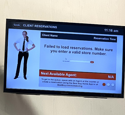 My appointment was at 11:00, the Geek counter was void of any signs of life. It was 11:16 and then I noticed the appointment screen they have on the wall was all screwed up (see photos). The first appointment displaying was at 11:40. Another individual was seated by me and his appointment was at 11:20. Still no signs of life at the Geek counter.