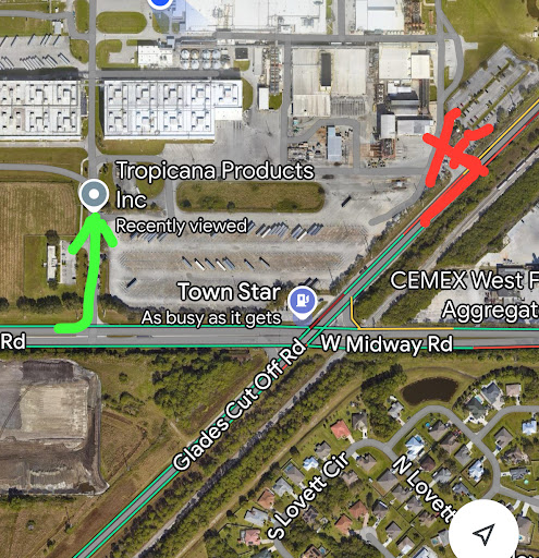 Nice easy access, lots of room to maneuver. If you are an OTR driver, after turning onto 712 make your first left before the light, NOT the entrance on Glades Cut Off rd like someone else stated. If you try to make this tight turn, you will most likely be turned around and or hit the barrier, just look how black it is from previous tires running up on it. This entrance is most likely for fruit trucks and others, not OTR! Again, turn left before the light after exiting 95!!!