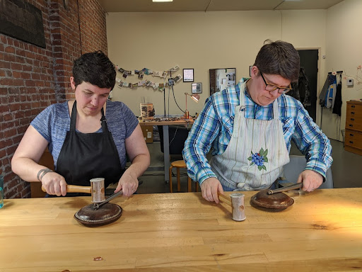 Read moreWe are so incredibly happy with our rings we made one summer afternoon with Stephanie. The experience meant so much to us on so many levels that it's probably impossible to fully express our gratitude and satisfaction. We had both been so nervous about the workshop (we're each sort of crafty in our own ways, but had never done anything like this) because it was new and we felt the pressure of doing something we'd never done before - and knowing that we'd be wearing the result of for the rest of our lives! Stephanie was so great from the moment we contacted her to the moment we left studio. She assured us that most people felt the same way, and that she'd walk us through every single step. Within the first half hour our nerves had disappeared and we were fully engaged in the process! The rest of the day flew by, but by the end we had made our bands and were already talking about when we could come back to make some more rings! After Stephanie set the stone LeAnna had selected, our rings were shipped to us a month or so later and we were SO excited to have them both finished. We absolutely love them, both because of the way they turned out and because of the experience of making them together. It's also so fun to share the story of making them with anyone who asks. We can't say enough about how perfect this experience was and how incredibly thoughtful, patient, professional, and kind Stephanie was. Additionally, Stephanie was immensely helpful in helping LeAnna pick a unique stone from a reputable source - without Stephanie's invaluable knowledge LeAnna would have ended up with a soft stone that would not have lasted. Stephanie answered every question we had about stones and settings and we ended up with the perfect rings for us. We'll be back - gotta add some band for an anniversary or find some excuse to...