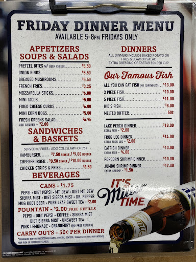 Read moreVFW's Friday night fish fry is the best deal of the Region. They serve walleye....properly fried....NEVER over fried so not even a tiny morsel of that delicious fish is lost. You get fries with that or a baked potato (wrapped in foil so steamed rather than baked) plus slaw or a salad. The slaw is good also. The meal is very reasonably priced for the quality. No frills ambiance but who cares. Pickup is fast and there is some...