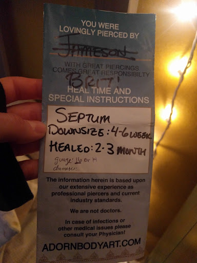 Update on 2/19/17: Today I went to Adorn to have my septum piercing switched out with a smaller hoop. I had my original piercing on 1/13 and was told (see photo) that I could have my hoop downsized 4-6 weeks after my original piercing. It has been over five weeks.