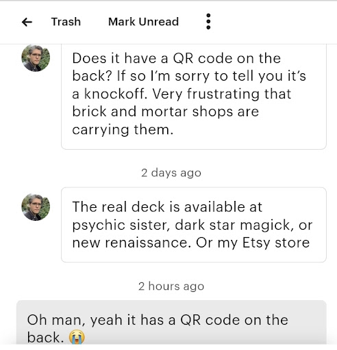 I was sold a knock-off tarot deck. I'm in town visiting. Popped into Flutter after having an amazing meal at Churn. I was drawn to these mini tarot decks they had displayed in a little bowl. The one I gravitated to was not in a plastic wrapper like the rest of them, and when I inquired about that upon checking out, both staff members assured me it was a complete deck. But when I got back to my friend's house, I opened it up and realized it was missing the guidebook. So, I googled the deck and found the maker on etsy. I messaged him, inquiring where I could get the guidebook. He told me that if the deck had a qr code on the back, it was, in fact, fake and not his original deck. I'm wondering how many other customers have been hoodwinked by this shop? And I wouldn't expect this kind of thing to happen at a local Portland establishment. I'm going to try to return it if I can, because it doesn't even have...