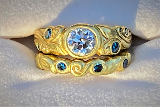Read moreThe minute I met Edith Armstrong in 2016 and saw her work at Folia I knew I wanted her to create a ring for me with my grandmother/mother's diamond that I had inherited many years ago. I liked the organic designs in her work such as leaves and swirls which reminded me of fiddlehead ferns. Also, I wanted a secure bevel setting for my diamond, so I could wear it all the time and not worry about prongs breaking. I appreciated Edith recommending 18K gold for my ring because the color enhances the stones and is so pretty. I had thought about Maine tourmaline for the little stones, but Edith said they would have been too soft. She suggested I use teal-colored blue diamonds and they are perfect. Then for my anniversary this past Christmas I had Edith create a wedding band to compliment my diamond ring. Again with blue diamonds, she made me the most beautiful ring. Everyone at Folia is great to work with and I highly recommend you take the time to visit their store in Portland. You won't be...