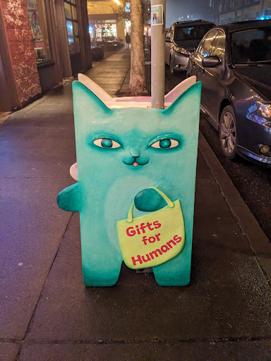 Read moreIf you're a cat person, you are going to love this store! SO many cute things for every age. From books, crafts, buttons, purses, stuffed animals, clothing (including some adorable onesies), to beautiful artwork done by local artists. There is something for everyone here. Reasonable prices too. The guy who was working was incredibly nice and gave my daughter a free sticker. The way they have the store set up with the stuffed cats climbing the trees made it fun for my 7yr old who thought it was the coolest thing ever. When we got home, she made a "tree" in her bedroom for her new kitty stuffy. We will...