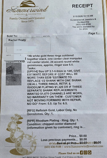 I went to another jeweler in Portsmouth with amazing reviews and was appalled to hear I didn't need most of that work done. I will eventually need to, but it wasn't something that needed to be done right away. This new jeweler said they would give me a call if my ring would cost more than $100-$200. Now THAT is a reasonable price to pay for the work I wanted done.