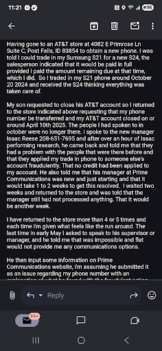 Original post. Granted these people no longer work there however I cant get this resolved by either AT&T or Prime Communications. Traded in a newer phone S21 for a S24 in October 24 and they committed fraud and applied the trade in to someone else account. Ive been paying for the new phone for Months now and found out about the fraud from new store manager in late February but he can't fix this without Prime Comm management taking action and neither can AT&T without Prime. I would not trust any AT&T store operated by Prime like this one, not at all. They let fraud happen without resolution, do not stand behind their employees actions. Pathetic customer service let alone being robbed of over $800 and there is nothing I can do about it. Thanks AT&T - I'll be leaving as soon as I can...