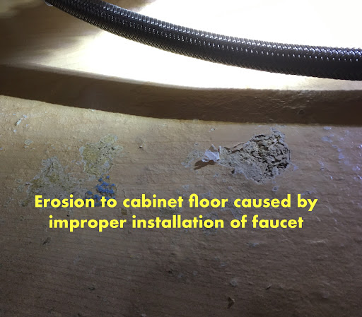 If it wasn't for the faucet developing a fault, which was nothing to do with the plumbing contractors, I wouldn't have looked under the sink and seen the layer of water on the cabinet floor, and the erosion.