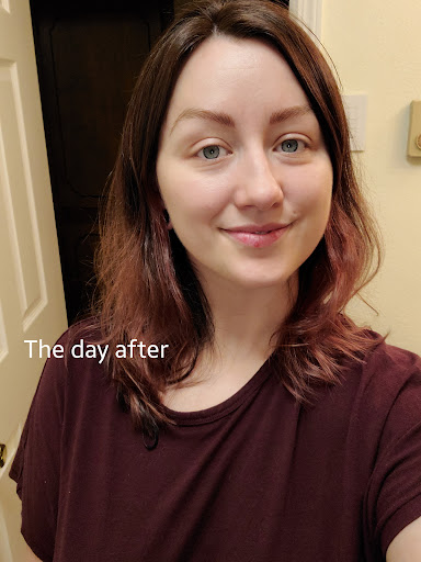 When she was done, I tried to look happy but was I internally freaking out. They looked so huge and dark, I was terrified. They looked darker the next day and I was thinking āwhat the hell did I do?!ā After a few days they got a little lighter, and I started getting used to having eyebrows. My eyebrows were so sparse to begin with, I wasnāt used to seeing myself with them.