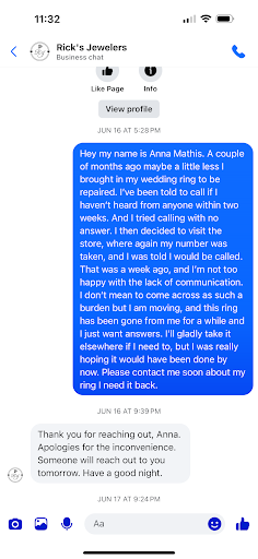 Ā Ā Ā Read moreI normally donāt leave bad reviews BUT goodness this one is a doozy! We took a ring in to get some diamonds reset into another setting around November 17th, 2024. This was my late motherās ring (very sentimental). I went in the first part of December to check on it because it was supposed to be finished by Christmas as a gift. I was told I would receive a call or a text with an update on the ring. Never got a call or a text from anyone at this establishment. However, my son went in several times, during this 3 month time span, to check on it and not knowing at the time, but apparently was being told lies about where the ring was and the progress of the ring each time he went in. We were told that they had to send the ring off to another Jeweler in another state, to get the work done. BUT couldnāt tell us where it was sent!!!! Found out yesterday that it was NEVER sent anywhere! So itās just been sitting there for almost 3 months with nothing being done to the ring! I walked in yesterday (2-12-2025) and told them who I was and wanted an update on the ring. They went around the corner and brought the ring out (not from a safe, that I saw) and handed me my ring. The ring should have been in a safe, given the appraised value from a reputable jeweler). She finally told me she couldnāt ārecallā the situation. Nothing was ever put in the computer for a paper trail. What jewelry store does this???? Will not ever walk in this...