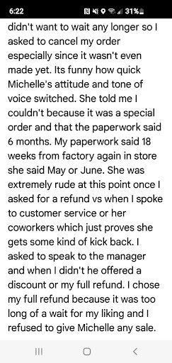 Read moreThis review is a reflection of our experience with the sales person, Michelle. The store manager, Shawn Hunter was great and the product seems quality. My husband and I went to the store back in January and placed an order for over $5000. Michelle was nice at that time because I'm sure she gets some kind of commission or perk for her sales. She told me then that we should expect our order to be in in May or June. She also told me she would call monthly to give me updates on our order which she NEVER did. Mid June came around and I called and was told that my order wouldn't be in until end of July. I didn't want to wait any longer so I asked to cancel my order especially since it wasn't even made yet. Its funny how quick Michelle's attitude and tone of voice switched. She told me I couldn't because it was a special order and that the paperwork said 6 months. My paperwork said 18 weeks from factory again in store she said May or June. She was extremely rude at this point once I asked for a refund vs when I spoke to customer service or her coworkers which just proves she gets some kind of kick back. I asked to speak to the manager and when I didn't he offered a discount or my full refund. I chose my full refund because it was too long of a wait for my liking and I refused to give...