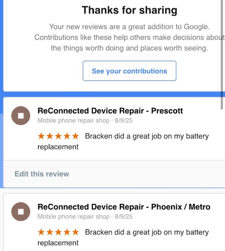 Read moreVery disappointed with this company, I went there 2 years ago and the service was great so I decided to go back 8/9/2025. I have an older phone that I just wanted the battery to be replaced. I told the guy I didn’t want to purchase a new phone I only wanted a battery, the phone wasn’t holding a charge very long and the phone would just shut down, I was asked how long that was happening and I said about a week. I was told it might be the motherboard in the phone, again I just said I just wanted a battery. When the guy came back with my phone he said the phone wasn’t holding a charge and was still shutting down and I could purchase a new phone, he would apply the $83. toward a new phone, and transfer all of my phone contents to the new phone. Again I said I didn’t want a new phone. I told him to give me my phone, with just a new battery. He said this happens to other people and they always come back to buy a new phone. I left but something wasn’t adding up. The phone was not holding any charge at all and was worse than the old battery. I decided to take my phone to batteries plus in Prescott Valley and asked him if he could tell me if the battery that was replaced in my phone was good or not. After he checked it he said the battery was not holding a charge and I probably got a bad battery, he suggested I take it back and get another battery or get a refund. I told him the guy at Reconnected Device probably would not give me a refund, he said he should since the battery is defective. So I go back and told the guy I went to batteries plus and told him what was said, i suggested he call the guy at Batteries Plus and he said I’m not going to call him, he’s nothing to me. I said I wanted my old battery back and told him to take the new battery back, that my old battery held a charge better than the battery he put in my phone, he yelled saying he would not give me my old battery back there was some kind of law he couldn’t and he couldn’t take out the new battery because it would harm the new battery. I told him I was going to write a really bad review if he didn’t give me my old battery, He finally gave me back my battery, however he did not give me a refund, I went back to batteries plus I asked him if it was true if a battery was taken out it damages the new battery, he said it was not true. So he replaced the supposedly new battery with my old battery and I had him order a new battery for me. It is my opinion that reconnect device repair has really gone down hill I believe the guy I worked with that day was called Bracken, I think he is a con, I will never go back there and not recommend them to anyone. I did write a review because I don’t want anyone else to experience what I did. I also received an email saying I wrote a 5 star review and Bracken did a great job on my battery. I never wrote that review its a fake. Makes you wonder what...