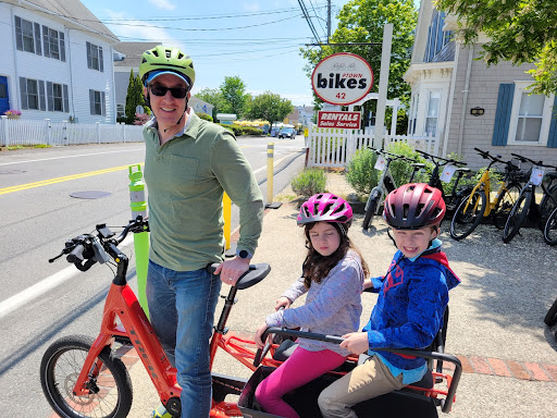 We were considering renting bikes but were concerned about our 6 and 8 year old children regarding the traffic, pedestrians, and fitness level if they had their own bikes. (P-town and the biking trails are surprisingly hilly). A number of bike rental places in P-town have electric bikes but most if not all had only single seated bikes. We ended up having lunch at Liz's (after a $25 cab ride) and saw P-town Bikes had out front a Trek Fetch. This is an electric bike that can carry two children that has a padded seat, foot well panniers, and a wrap around safety bar. When we saw that bike out front angels started singing in our ears and we immediately went into Bill's shop to inquire about rentals. The pricing was competitive and when we did the quick math (compounded with the level of freedom this would provide) it was a no brainer. We rented the Fetch for myself (and our two kids whom are approx. 50 lbs, and 60 lbs), and a single electric bike with a basket for my wife, helmets and locks were included. We suddenly had the entire P-town peninsula at our fingertips as the electric bikes enabled us to easily travel between 15 and 20 mph cruising speed. Combined with the 175 lbs. cargo carrying capacity of the bike allowed us to move around almost as fast as a car (if desired) with the convenience of parking a bicycle. We were able to easily ride anywhere we wanted to go as well as out to Race Point beach using the bike paths. My kids loved it and were sticking their arms up shouting with glee that it was like being a on a roller coaster (when we were going top speed).
