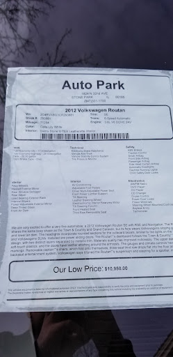 Read moreLet me start by saying that my experience during the sales process was wonderful. Nash was very helpful and kind and was not pushy at all when I was deciding if I should purchase the vehicle. After the purchase was made is where things went downhill. I purchased a 2012 Volkswagon Routan and was assured that it was a "10 out of 10" and their website even boasted that it was certified. The day after I purchased the vehicle the engine light came on. I took it to my local O'Reilly to have the codes read and it turned out to be the catalytic converters. Luckily there is an 80k mile federal emissions warranty that covers the converters so I had to take it to my nearest Volkswagon dealership which was about 45 miles away. They covered the converters under the warranty which was great but then the vehicle was failing to start and required a TIPM (totally integrated power module) which cost me nearly $1,000 (almost 10% of the vehicle price which I haven't even owned for an entire month yet). I called Auto Park to see if there was any way they could reimburse me for this since the vehicle was supposedly certified and I had 2 major issues the day after I drove it off the lot. I spoke with the manager Andy and the best he could do for me was a free break service (labor only) and their dealership is 75 miles away from me so that really doesn't help me much. Very disappointed in this dealerships willingness to stand behind their vehicles, would not recommend making a purchase from them unless you have a pre-buy inspection done on the vehicle by someone...