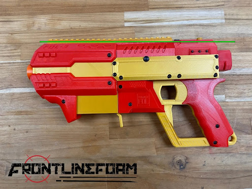 My most recent experience with seeing one of their parts in person was on Saturday Feb. 12. It was a Rainbow pistol with a wobbly, uncomfortable grip. I've never liked 3d printed grips on NIC blasters, but this one was a pain to hold even by block-of-wood-as-a-handle designs go that I've held before and having wobble on one of the most structurally important parts of a homemade?? While I have seen built blasters that look and feel like they should from them, there have also been things that really shouldn't have been sent out. And that really defines Frontline Foam to me; why order from them with their history of bad QC? Heck, even an FDL in one of their product shots isn't aligned properly lol! I added a green line that was perfectly flat to the rail so you can see it.