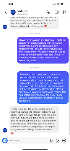 i went into shop valore a couple of days ago to explain and show that my gem ring is not the one that i had made and purchased, they told me that they have no idea and to message the shop through instagram regarding the color change. so i did and this was the response that i received⦠i am honestly so disappointed at the negative response that i had got. i am not asking for a free ring, i just want what i had paid for. the owner of shop valore responded in a negative way that made me upset knowing that my ring couldnāt be fixed and nothing that they will do for me.