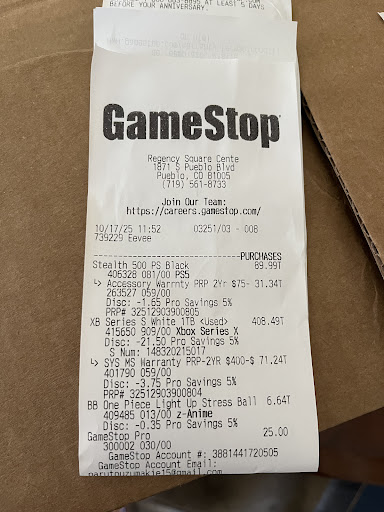 Okay, so I'm gonna start off by saying that I have been a customer with gamestop since they were. Software cetera in the mall years and years ago. Each time I've went into gamestop. I've had nothing but a pleasant experience. I've known a lot of the workers for years as well as hung out with them and consider them. Most friends however, this last time I went in was probably the worst experience. I've had thus far by going to gamestop in the well over fifteen years. Now I also want to start off and say that Claire. The manager has been helpful. Yesterday I went in to go trade in some items to get a couple of new items. The items I went to go get was a 1 TB CJ hard drive for the Xbox, as well as an Xbox Series X controller, the elites series 2. Upon getting to the store, it took roughly about 45 minutes. For Claire to be able to help me due to the fact that she was the only one working and she was busy. Once I was able to be helped, I inquired about the controller as well as the sea gates. She went and got the items and wrung me up. I taken back a headsets. A controller with 2 battery packs. 2 switch controllers as well as 6 switch cartridges that were inside of a translucent's red case and 2 Xbox Series X games. I was told that the headset was not able to be taken in which is fine. The other items were taken in. However, the video games were not on the receipts. When I got home, I looked everywhere for the video games and could not find them. I back cracked inside of my father's vehicle as well as drove back. 2 games stopped to see if I could locate the games. However, I was unable to find them. I came back home and looked everywhere here in the house. And they are not anywhere that I can find. I have only been 3 places since going to gamestop my house. My father's vehicle and gamestop, so I'm not entirely sure. What could have happened to those games between them? But I know I did take them into gamestop to sell them towards this transaction. Also upon getting home. I noticed that there were components missing inside of the controller box. As you can imagine, that was very frustrating as well as my $25 gift card. 4 Xbox live that I had paid for that was on. The receipt was not in the bag as well. All I am asking is for this to be made rights for me to get the credit that I was owed as well as just have this entire situation taken care of as soon as possible. I will be contacting gamestop customer support through the 1 800 number. I hope you have a...