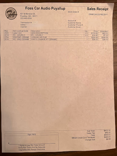 I have been working on building a stereo system for the last couple of years. I have researched components for my Lexus HS250h and have been to several shops to get an estimate as to what it would cost to install and the time it would take. I spent around two weeks stopping off at different shops in the area. My first stop was Foss. I spoke with CJ and he was very up front and professional. However, I felt his quote was really high. I ended up at three different car toys (all gave different quotes all over the board.) I ended up at Epic customs in Tacoma. Great clean shop. However, I was not going to pay their install cost (The install cost was thousands and more than the cost of my total equipment to be installed.) I even went to Best Buy and found out they do not build custom boxes. Zero fabrication. I ended up going to a trusted source and they ended up messing up my car, stereo and interior. I thought I could save a buck or three by going this route. Boy was I wrong. Lexus was going to charge on the upwards of 2k just to put my car back together. On the strength of a friends recommendation I ended up calling CJ back at Foss Audio & Tint. Albeit I was very embarrassed that I passed them up to begin with. CJ and his team of trained staff were confident they could do the install as well as put my poor Lexus back together. I have a few thousand dollars in equipment. I am fully aware that quality and speed usually does not go hand in hand. I was prepared to leave my vehicle for a few days. However, after I saw what they could do as far as customizations my order changed. I wanted another sub. I changed processors, I swapped my mids and tweets to a better model. I didn't feel any pressure to do so. I wanted the best that I could afford. I also utilized their MESA Credit (easy credit app. I was approved in less than 5 minutes.) After my indecisiveness CJ and Sean were able to create a high fidelity showpiece that sounds monstrous, turns heads and is 100% hidden. YES HIDDEN. I also had a custom alarm with remote start installed. It is pretty awesome. I can track my cars location, see how fast it is going and can even remotely kill it (like the bait car tv show.)