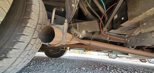 He changed the tire but had to cut part of the exhaust pipe away before he could put the tires back on the rear. He also wired the pipe to support it until I could get it properly repaired.