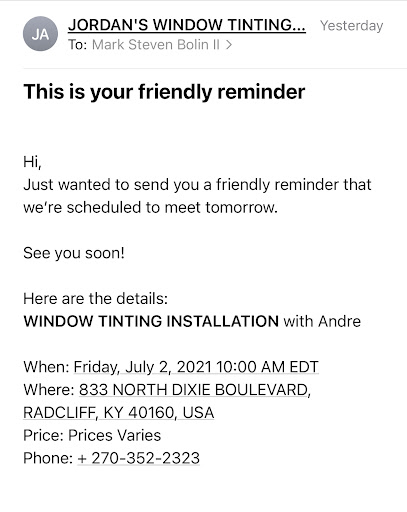 I stepped up to the counter and he asked me if I had an appointment and I said yes I made it online. He did say that the website should have not allowed me to set an appointment and that he was not tracking me on the schedule. I showed him the email showing the confirmation so he could be aware that his website indeed allowed ppl to schedule an appointment with his establishment. He was like well it shouldn't have let you and no need to show him the email. He asked for my information and asked what I was needing to be done. I informed him I was wanting my windows tinted and to make it whatever the State of Ohio allows. He came back and was like you should have done your research and that it was not his job to tell him that considering he was in the state of Kentucky. Even though he might have been right. I should have done the research, I was just surprised by his remarks. I've been to several tinting establishments that provide excellent customer service provide that information to their customers.