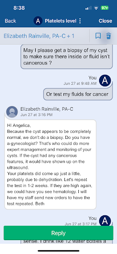 Read moreMy doctors office said that they won’t switch my doctors. I said I can’t wait a week to order new blood tests I have a huge cyst fever everyday. My doctor works only once a week. I said switch me back to my old doctor who works full time and messages me back the same day not wait a whole week. Cancer runs in my family and she said I’m not testing you for cancer it isn’t necessary. Then I ask to have hematology blood test to find out what’s wrong because my platelets jumped up three times in one week. Blood work three days. She said no let’s repeat all blood work see if it elevated and it did and she still hasn’t messaged me back. They want me to die! I’m insulted my birth mother had ovarian cancer had her tubes tied mid twenties. My aunt had ovarian cancer twice! My doctor said I don’t show any signs of cancer. My blood clearly states platelets 555 it jumped 70% within 4 days! Sent me back three days out of one week just to prove my platelets jumped up. Now I’m waiting a week later for Beth Rainville to message me back. My rbc levels are extremely high and my white blood cells are good. Kidney fine gallbladder fine!! I’m very upset. I have a cyst on my right ovary 4.9cm or larger !!! I need my old primary Mercedes Timko back best doctor I had. She always listened and discussed my blood work with me same day or next business day not a week later! I’ve had fevers 100.4 but, no. Now I’m stuck waiting and having a doctor who won’t take me seriously. Something has to be done...