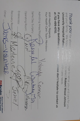 To Whom it May Concern at Robert Wood Johnson Hospital of Rahway NJ, I had a Horrific event at this Facility. A delay that was truly uncalled for. But everyone else we dealt with was very Professional & Caring. First, prior to 9/27/23 via phone calls, Lovely Keysha I believe for co pay, very informative & polite Lauren from I believe PAT who went out of her way with information. Then Lovely Lucy from anesthesia dept who truly put me at ease. They Helped answer all my questions & listened to all my concerns. Now those who took Wonderful Care of me on 9/27/23 was in SDU: Lovely and professional team, Renee RN who did my H&P, Komal RN, Shefali Medical Assistant, Cissy Nurses Assistant, Judy RN BSN (discharge RN) and Jagit Support aid/ Housekeeping. The wonderful Kind Anesthesiologist Dr William Tronolone & most skillful Radiologist Dr Nathan Chris, esp the two Radiology RNs, Rose & Maureen. Whom I spoke with prior to coming in for pre op instructions. Your TLC was amazing! The PACU team was outstanding, Esp Marlene and Myrda. The Rushing & Stress created from the delay & hold up due to Admission/ Registration Department, the Registra, Danael or Daney who misread the information in the computer that I was Authorized the day before & at 6 am, then at 8:30 am I was not. Over 2 1/2 hr delay, we were Pacified they were working on it! They never called my insurance. I needed NO Authorization was needed for a Surgical Biopsy! This refusal was for a MRI of the Pelvis back in August! The need for proper training for this Register is truly required. I am so annoyed that they had the Audacity to say to my face they took care of it after I took care of it for them. 1 1/2 hrs I spoke, was on hold many times with my insurance company & conference calls included. All they did was fixed it in the computer system! Thanks to Professional Registra, Nancy who carefully listening to my complaints & sending us to Admissions. This 2 1/2 hr plus time wasted created a Domino Affect that lead to a Stressful Havoc of everyone rushing around doing everything STAT! Now I did have the surgical procedure. My arm still hurts a bit from my IV but this is expected, under the circumstances they had little time to change the site. The pain from this before, during, & after my Procedure actually took my mind off the procedure itself. I had to be awake due to prone position I had to be in for this deep core biopsy. Dr Tronolone meds did kept me still for the procedure & the painful local anesthetic. Now My Husband, Gary Sullivan (CEO of AWE)was treated kindly & with respect. The SDU & other Staff asking him if he needed anything,etc., was outstanding! Good customer service! Which left Gary a wonderful feeling about this hospital at the end. He speaks highly over the care we received after admitted. I will hesitate for referring anyone here & for my next visit due to the Admission/Registration Dept! Not for the wonderful care once I was admitted. I will provide any information so this delay never happens again! I hope my next visit goes more smoothly. I will make myself available for meeting any of you personally to resolve this issue or talk over the phone. A little about me, I was chosen & attended classes to become one of the Customer Service Ambassador at WS Campus of Trinitas RMC Hospital in Elizabeth NJ. I worked as a a RN in many areas including Orthopedic, Med/Surg, Gyn & became Clinical Coordinator of Minor Surgery/Chemo Clinic/ Endoscopy & then PAT for many years. Had 39 yrs of service plus 7 yrs of Volunteer work since 1973. I was awarded several awards including a Distinguished Humanitarian Award & Daisy Awards. So when a Pat on the back is needed. Please include these staff mentioned above. My physician, the most intelligent, skillful Dr David Wexler who saved my life, my husbands & my brothers, chose your Facility, to perform this Biopsy due to your skillful Radiologist & Team in Radiology, PACU & SDU. Thank you for your time & Most Sincerely Yours, Rosemary...