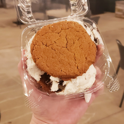 I ordered and ice cream sandwich and this wonderful woman loaded me up! She put that first scoop of ice cream on the cookie and I was thinking "looking good!" Then the second scoop was put on it. I was excited! Then she went for a third scoop, I about died. She doesn't hold back on the ice cream. Then, she knows her clients well "you need a spoon?" Well, I didn't think I did but looking at this monstrous ice cream sandwich, I probably need one.
