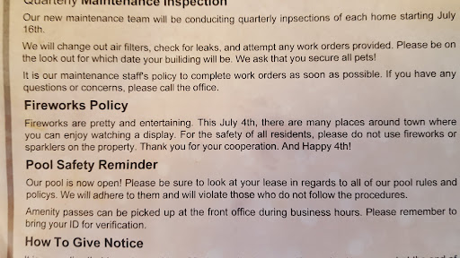 When we first moved in, the model apartment they showed us looked nothing like the apartment we were expecting. They do not keep up with the property AT ALL. They have these "property maintenance workers" that drive around on golf carts smoking cigarettes all day. I don't know where they find these people or if they are even qualified to do the work that is expected of them! The oven had a lighting glitch, so the light wouldn't work properly. The entire apartment smelled of cigarettes, like the previous tenant had smoked in there, even though it is supposed to be non-smoking. The doors never fit properly into the door frames, so closing the doors was a struggle. When you stand in the shower, it shifts or creaks, like they weren't installed properly. There is no support underneath the shower for weight, so it feels like you’re going to fall through. The mailboxes, I should use that term loosely, need to be completely replaced and are a joke. The cabinets were stained on the inside in the kitchen area. The refrigerator had a large gash in it on the front of the aluminum paneling, from the moving process when the workers installed the refrigerator in the kitchen. Outside our front door, there was no drainage of excess water during heavy rains. There was always a giant flood outside our door and made entering and exiting the apartment almost impossible, during the rain. We have constantly complained to the office about this situation and their only solution was to place a 2X4 against the side walk, which DID NOT help! The windows are also of terrible quality. All the heat you pay for during the winter months goes straight out the window!! You might as well through a bag of cash outside.There were also constant drug dealing outside our apartment in the parking lot in front of us, due to the parolee that lived a couple apartments down. How do I know that you say, because his parole officer visited our apartment on accident thinking it was his!!!