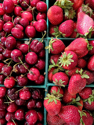 Great in house strawberries. They hand check every single one before putting it for sell. Cherries are from Stockton...